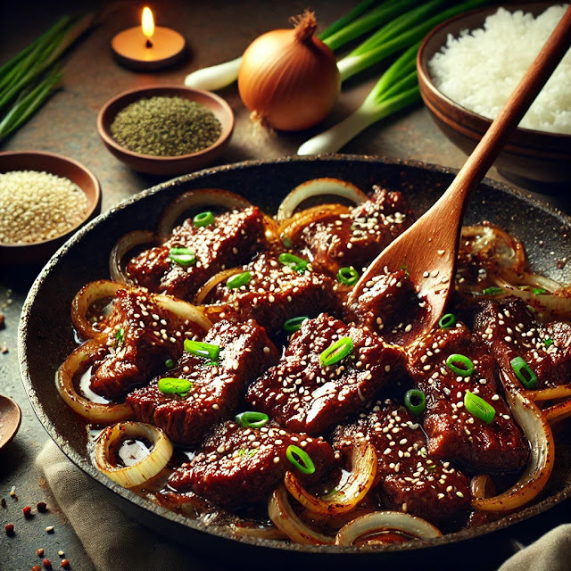 - 조리: 중불로 예열한 팬에 기름을 살짝 두르고 양파부터 볶아줍니다. 양파가 투명해지면 양념한 고기와 대파를 넣고 볶습니다.